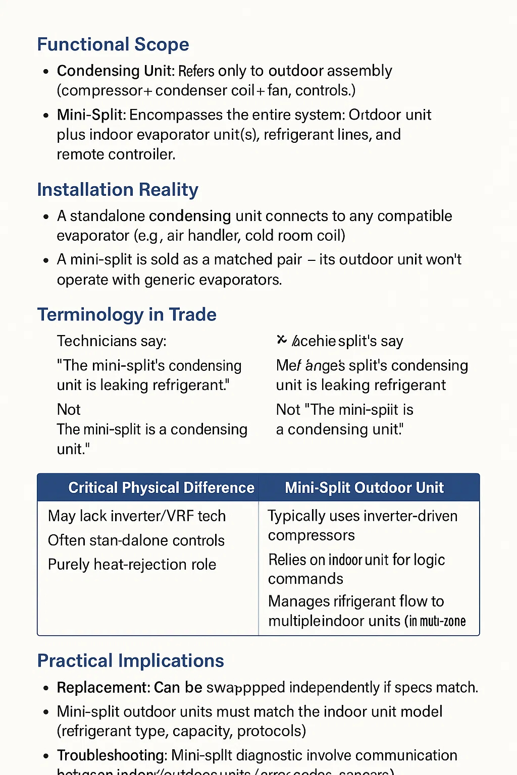 Mini-split: omfatter hele systemet: utendørs kondenseringsenhet pluss innendørs fordamperenhet (er), kjølemediumlinjer og fjernkontroller.
